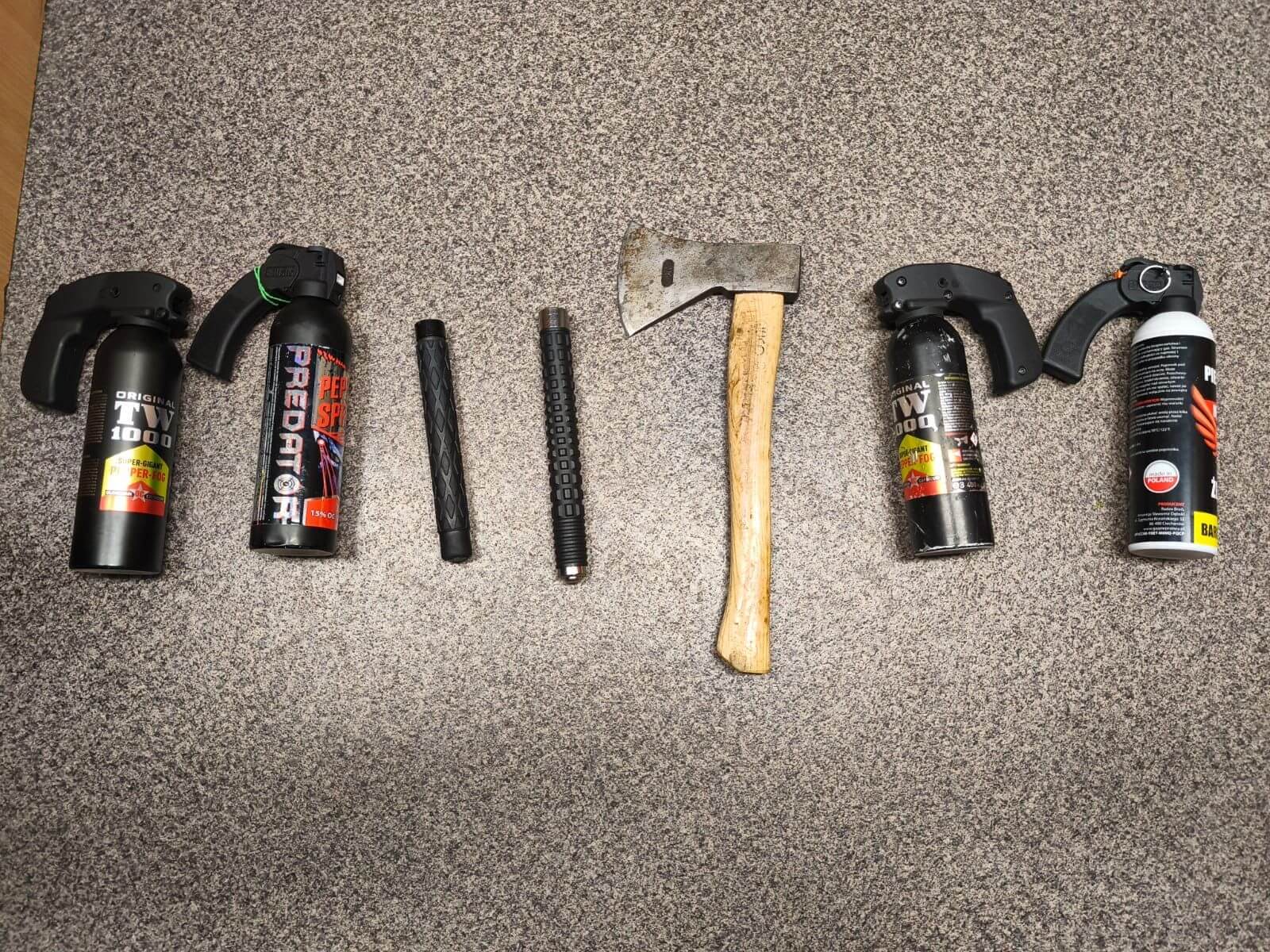 Starszy z nich zachowywał się agresywnie, używał wulgaryzmów i zakłócał porządek publiczny. W trakcie kontroli ujawniono przy nim siekierę oraz gaz pieprzowy. Z kolei nieletni posiadał przy sobie kilka pojemników z gazem oraz pałki teleskopowe.